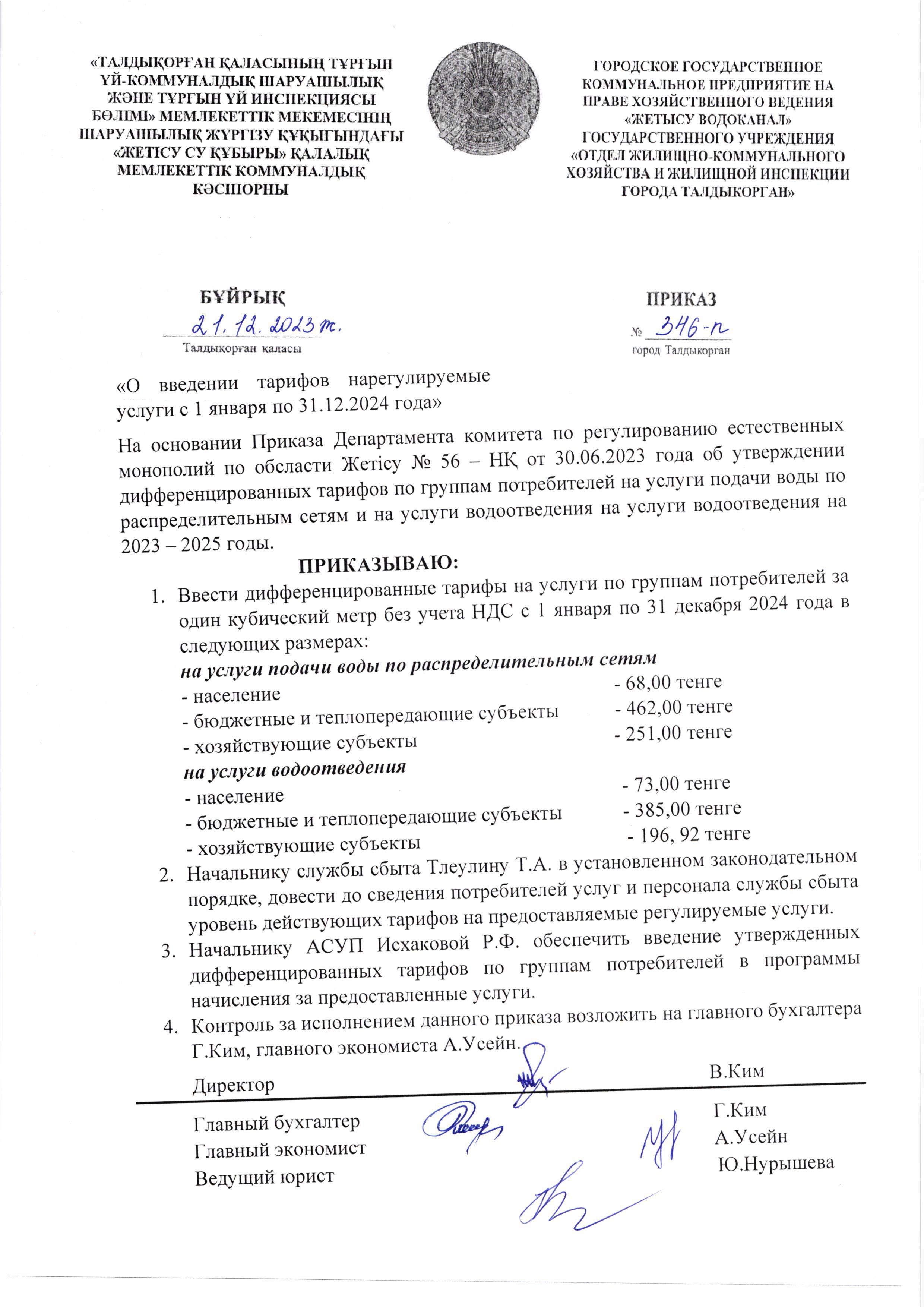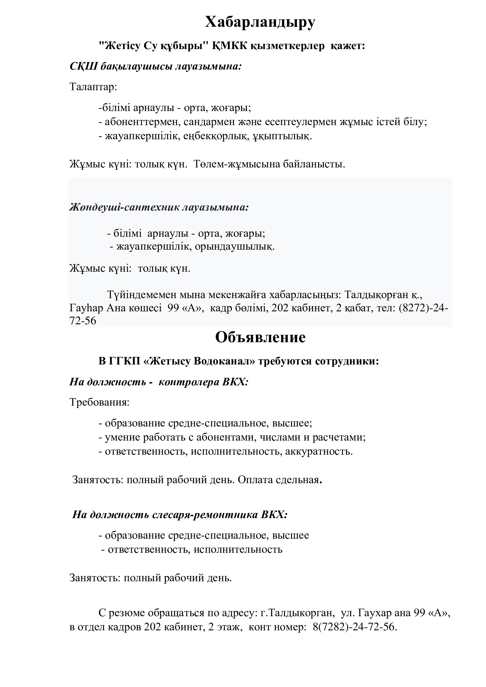 Публичные слушания по итогам 2016 года Согласно подпункта 7-3 статьи 7 Правил проведения ежегодного отчета о деятельности субъекта естественной монополии по предоставлению регулируемых услуг ( товаров, работ) перед потребителями и иными заинтересованными лицами, утвержденных постановлением Правительства Республики Казахстан от 31 октября 2011 года №1246, уведомляем потребителей и иных заинтересованных лиц о предстоящем проведении слушания по ежегодному отчету деятельности по предоставлению регулируемых услуг водоснабжения и водоотведения за 2016 год, которое состоится 14 апреля 2017 года в 15:00, по адресу Кабанбай батыра 78. Администрация ГГКП на ПХВ «Жетысу Водоканал» |