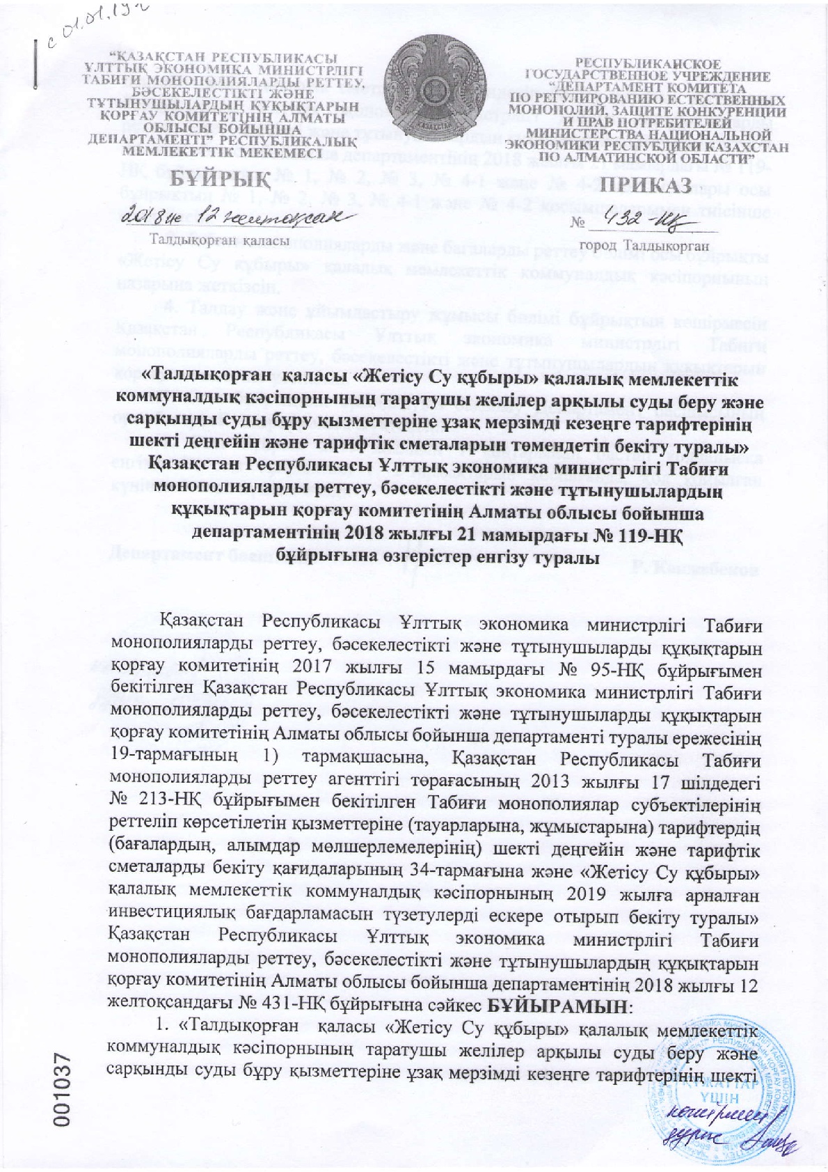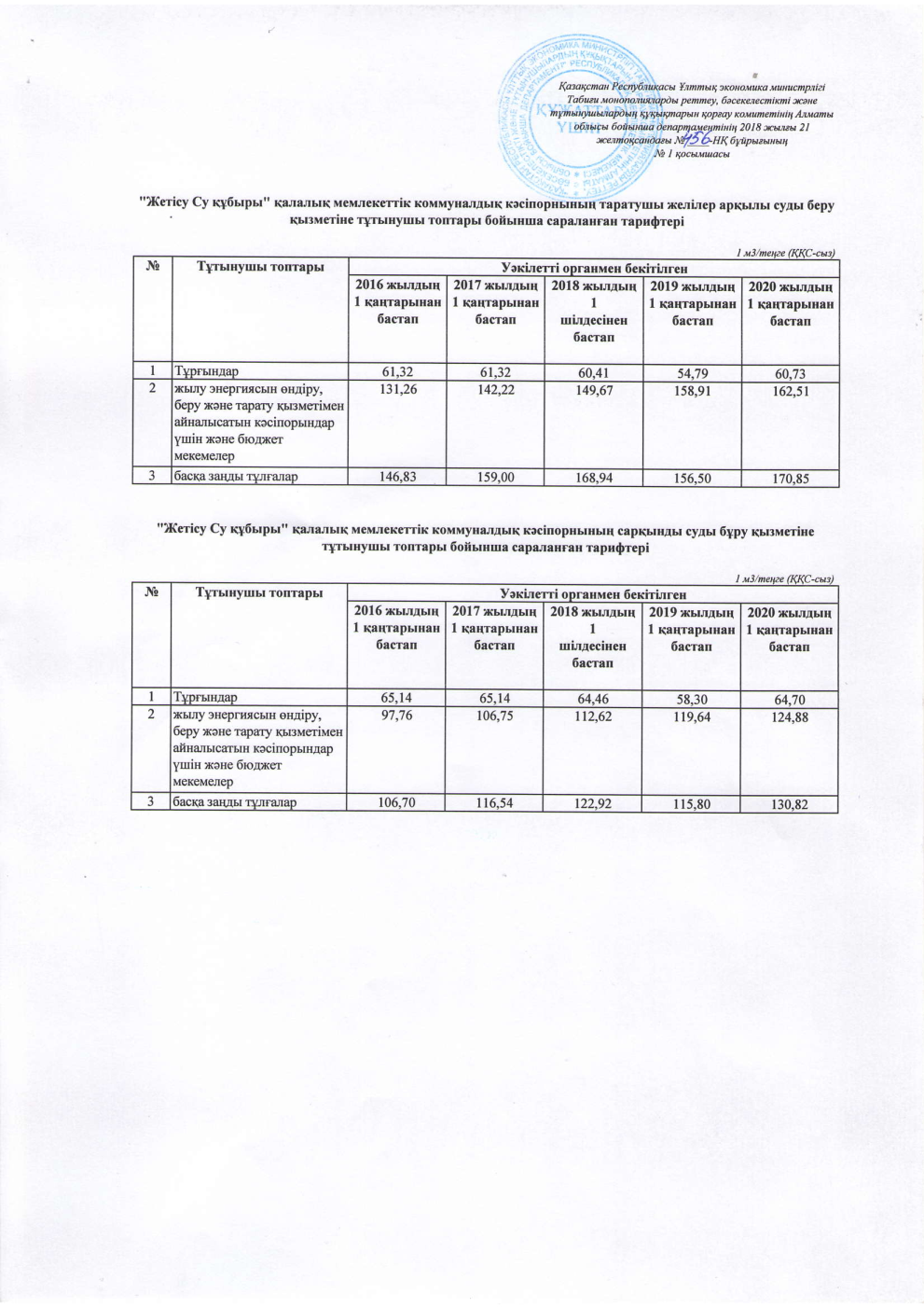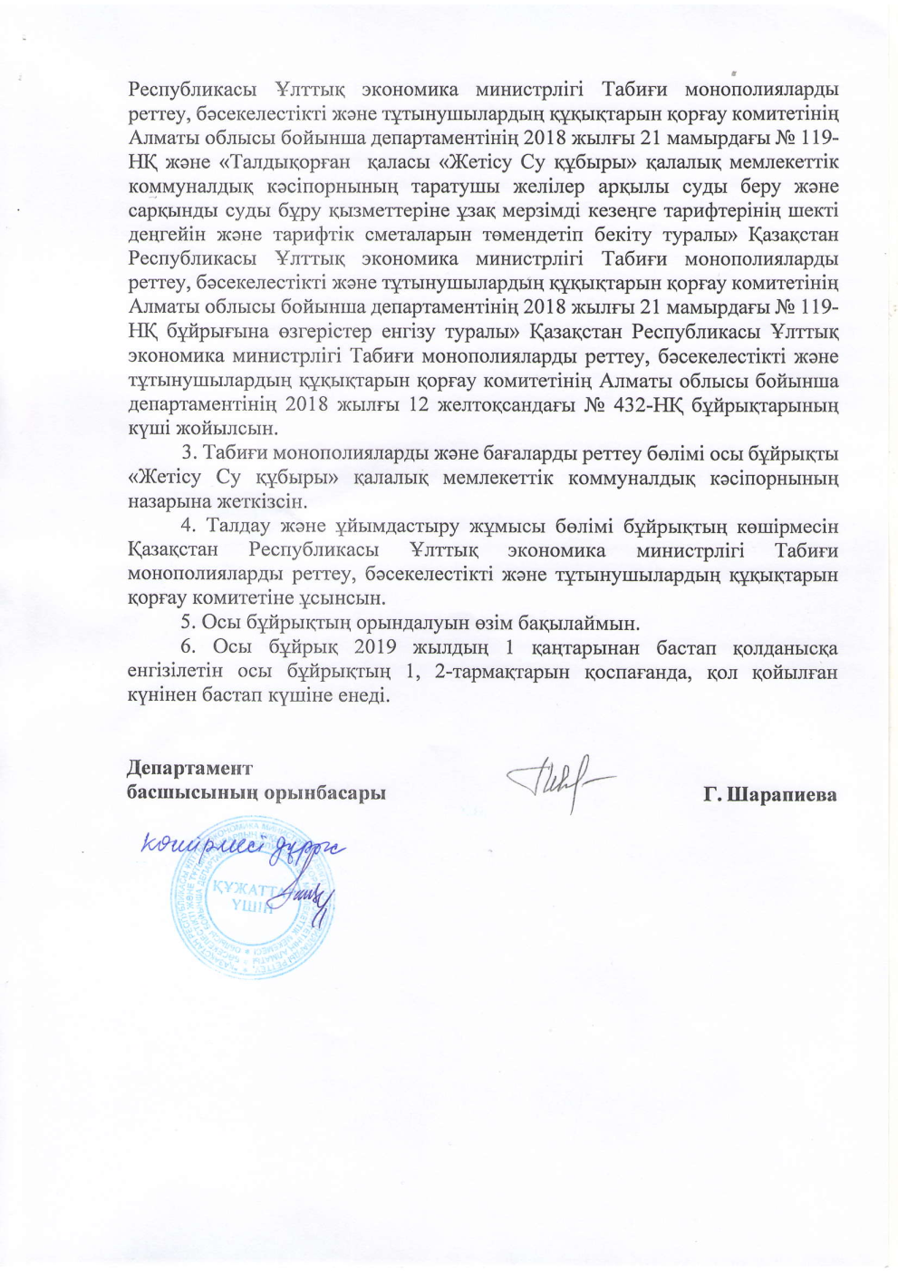Публичные слушания по итогам 2017 года Согласно Правил проведения ежегодного отчета о деятельности субъекта естественной монополии по предоставлению регулируемых услуг (товаров, работ) перед потребителями и иными заинтересованными лицами, утвержденных Приказом Министра национальной экономики Республики Казахстан от 18 декабря 2014 года №150, уведомляем Вас о предстоящем проведении слушания по ежегодному отчету деятельности по предоставлению регулируемых услуг водоснабжения и водоотведения за 2017 год, которое состоится 20 апреля 2018 года в 15:00, по адресу Кабанбай батыра 78. ═══════════════════════════════════════════════════════════ |