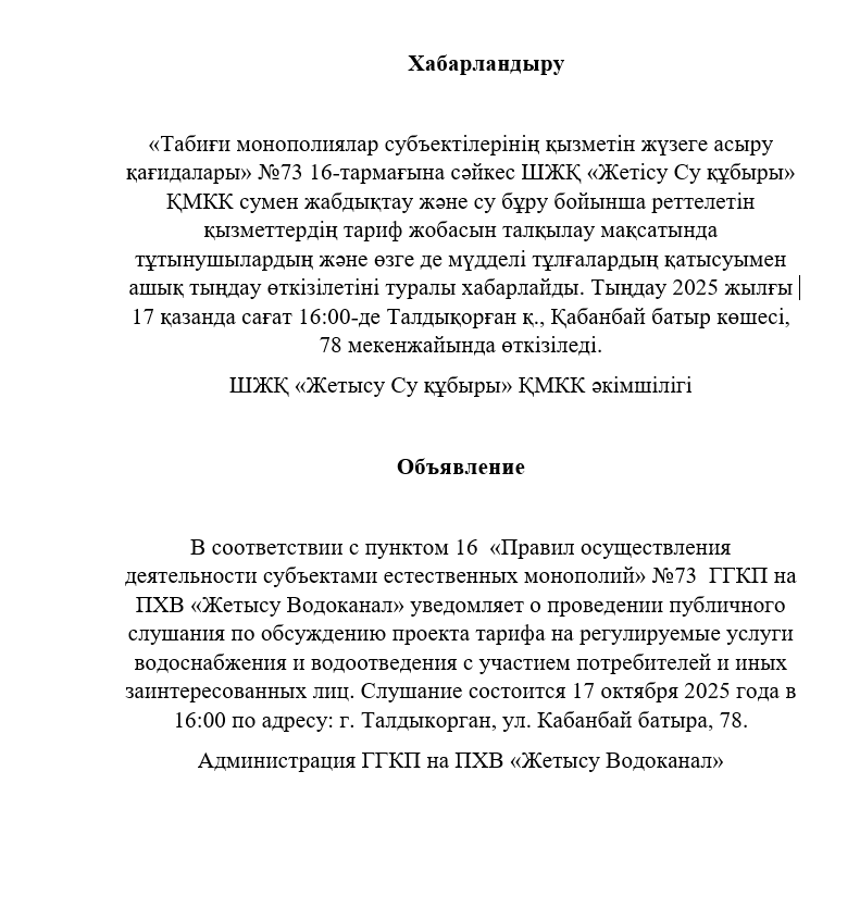 Публичные слушания по итогам 2016 года Согласно подпункта 7-3 статьи 7 Правил проведения ежегодного отчета о деятельности субъекта естественной монополии по предоставлению регулируемых услуг ( товаров, работ) перед потребителями и иными заинтересованными лицами, утвержденных постановлением Правительства Республики Казахстан от 31 октября 2011 года №1246, уведомляем потребителей и иных заинтересованных лиц о предстоящем проведении слушания по ежегодному отчету деятельности по предоставлению регулируемых услуг водоснабжения и водоотведения за 2016 год, которое состоится 14 апреля 2017 года в 15:00, по адресу Кабанбай батыра 78. Администрация ГГКП на ПХВ «Жетысу Водоканал» |