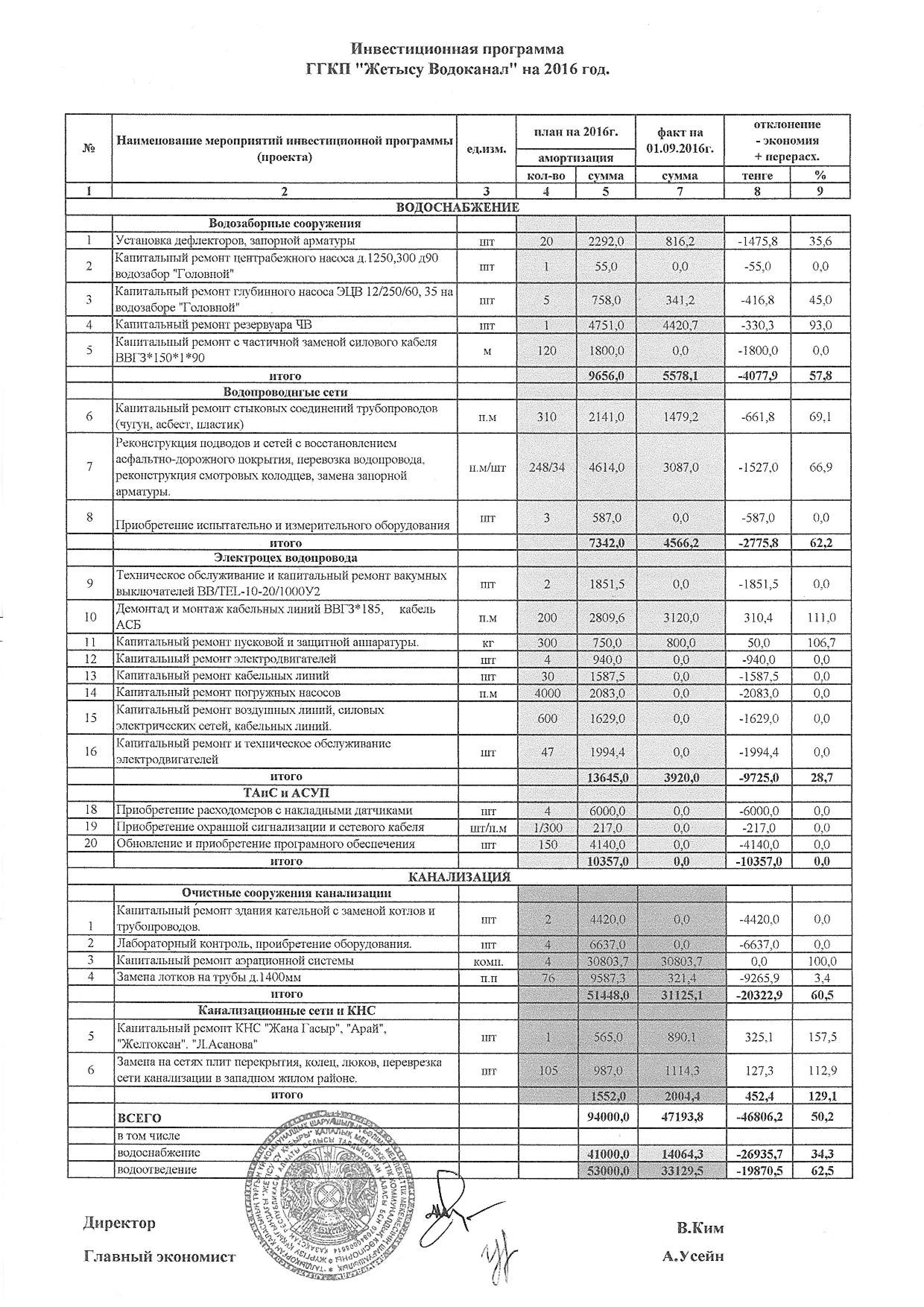 Исполнение инвестиционных мероприятий по ГГКП "Жетысу Водоканал" на 2015 год