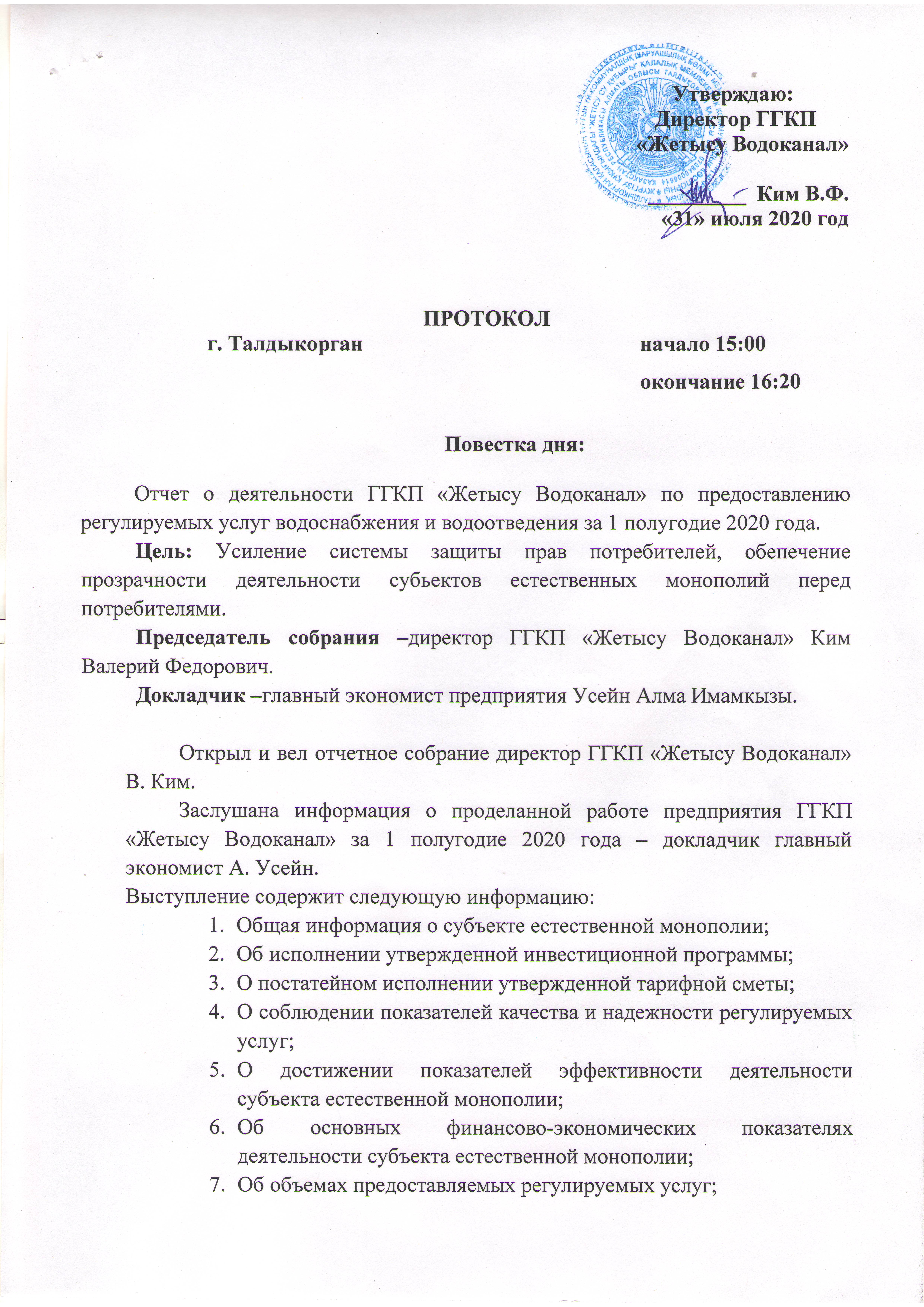 Протокол отчета ГГКП "Жетысу Водоканал" за 1 полугодие 2020 год