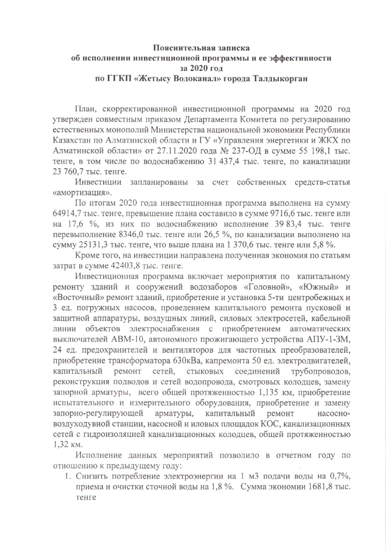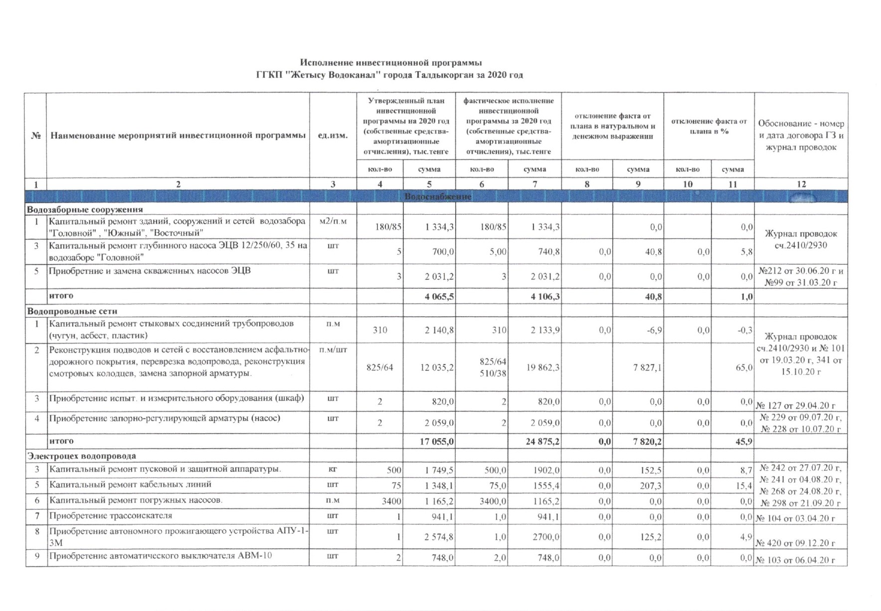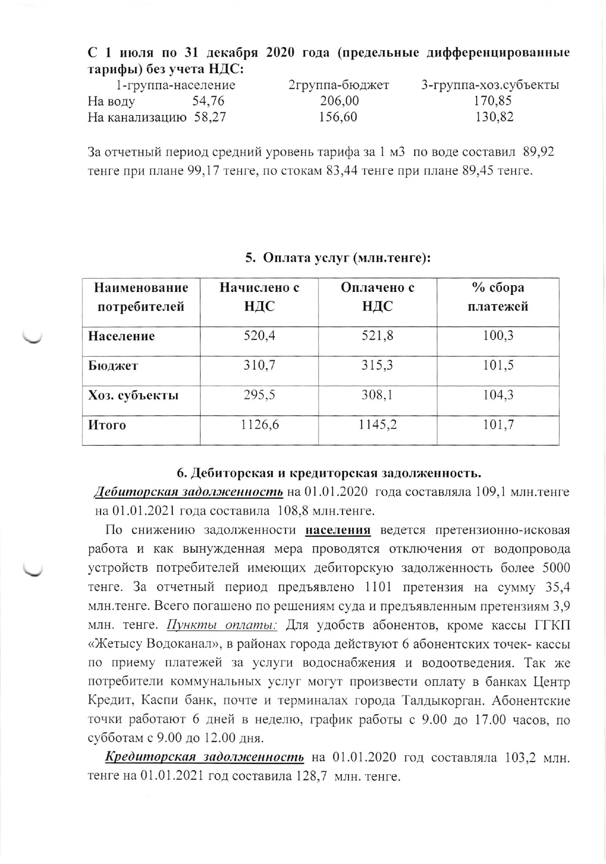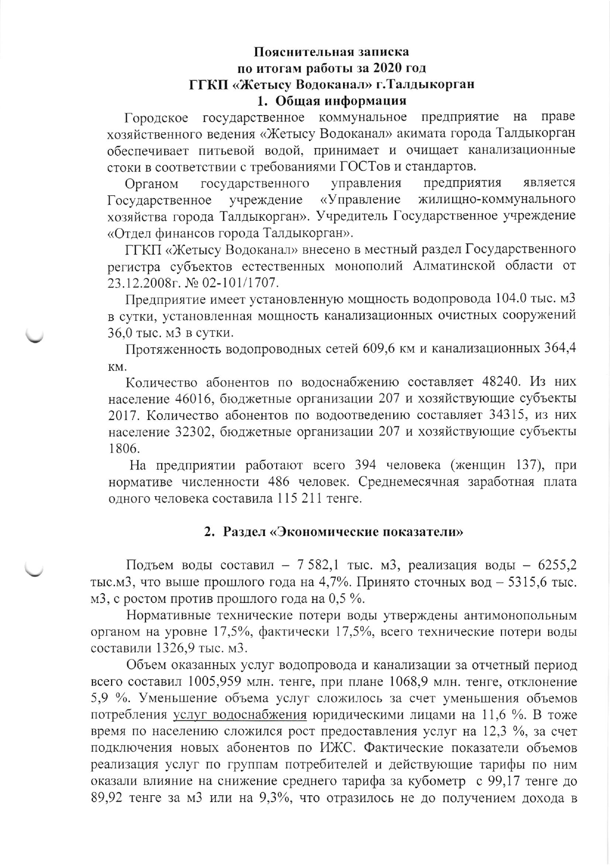 Отчет ГГКП "Жетысу Водоканал" за 2020 год