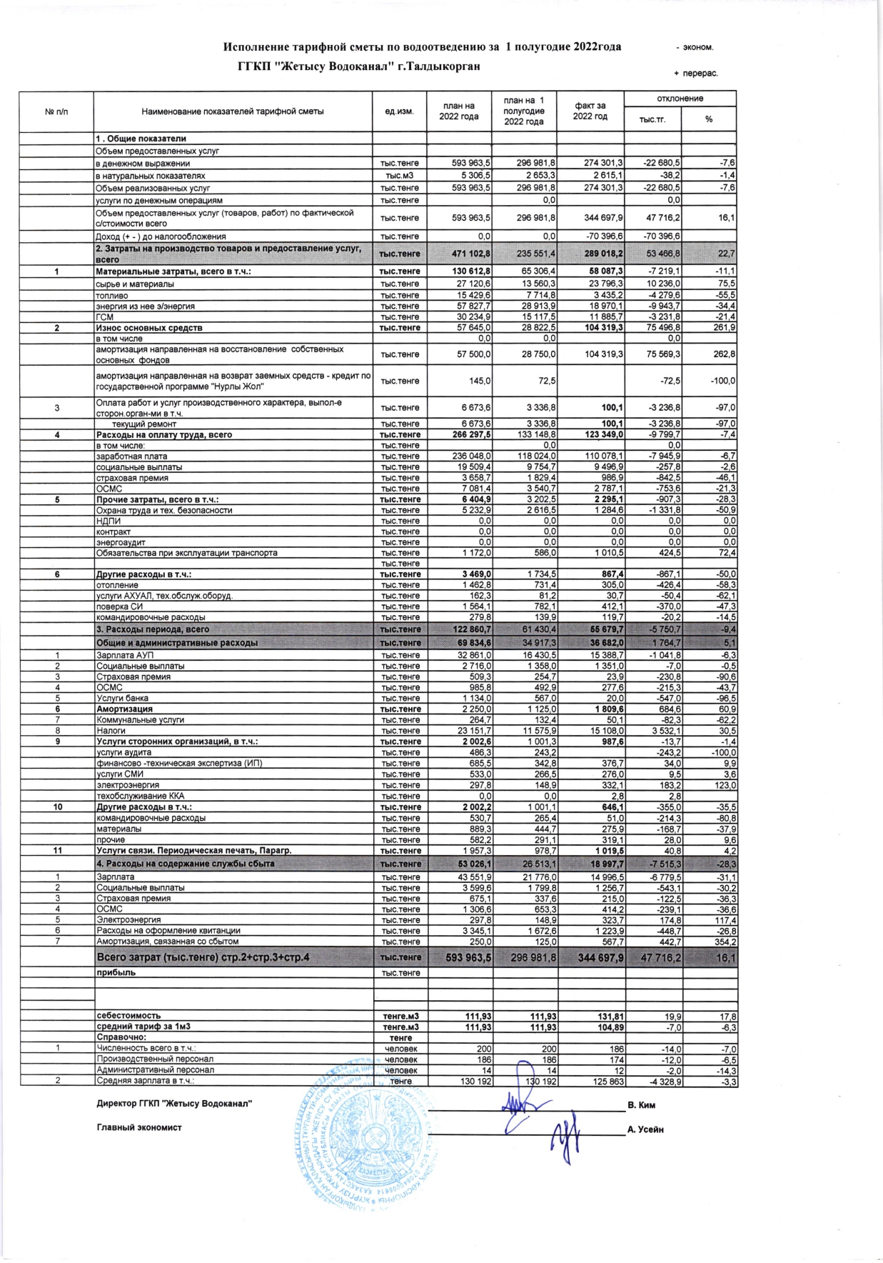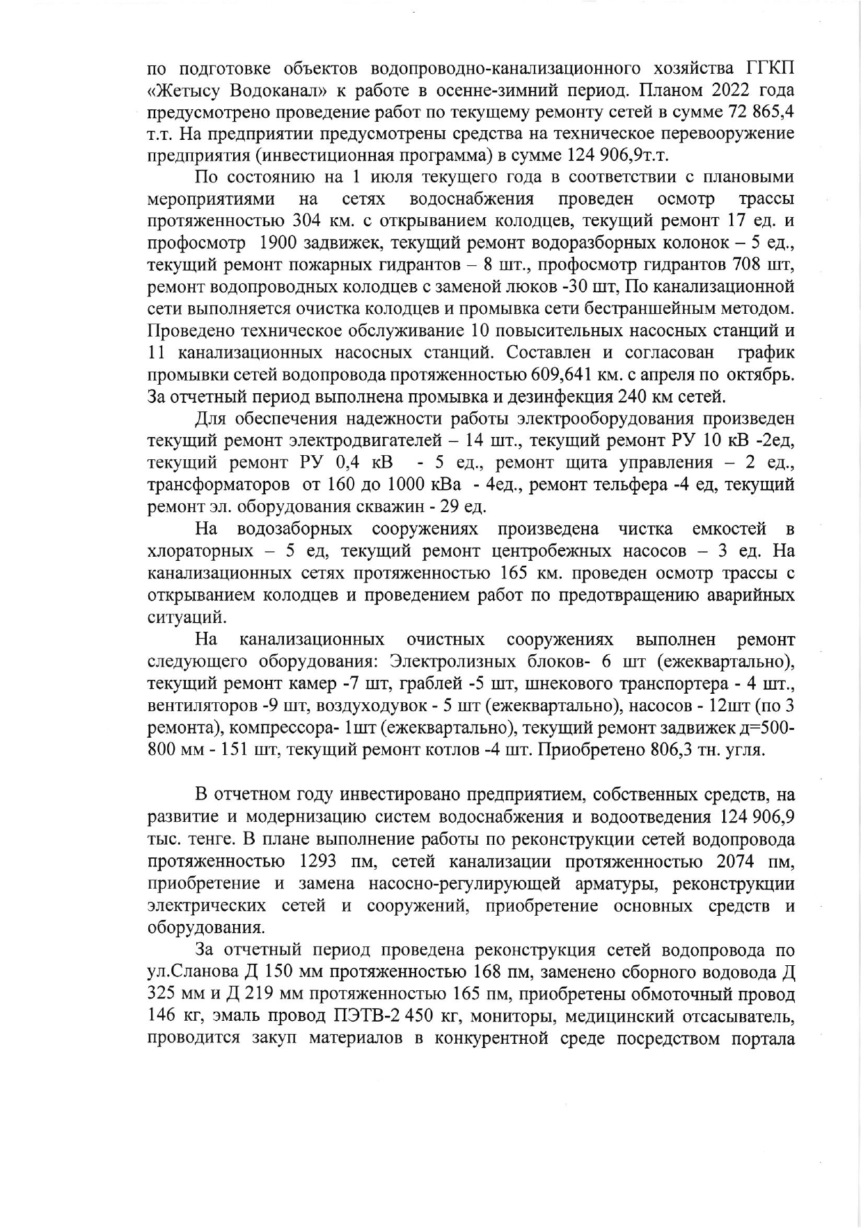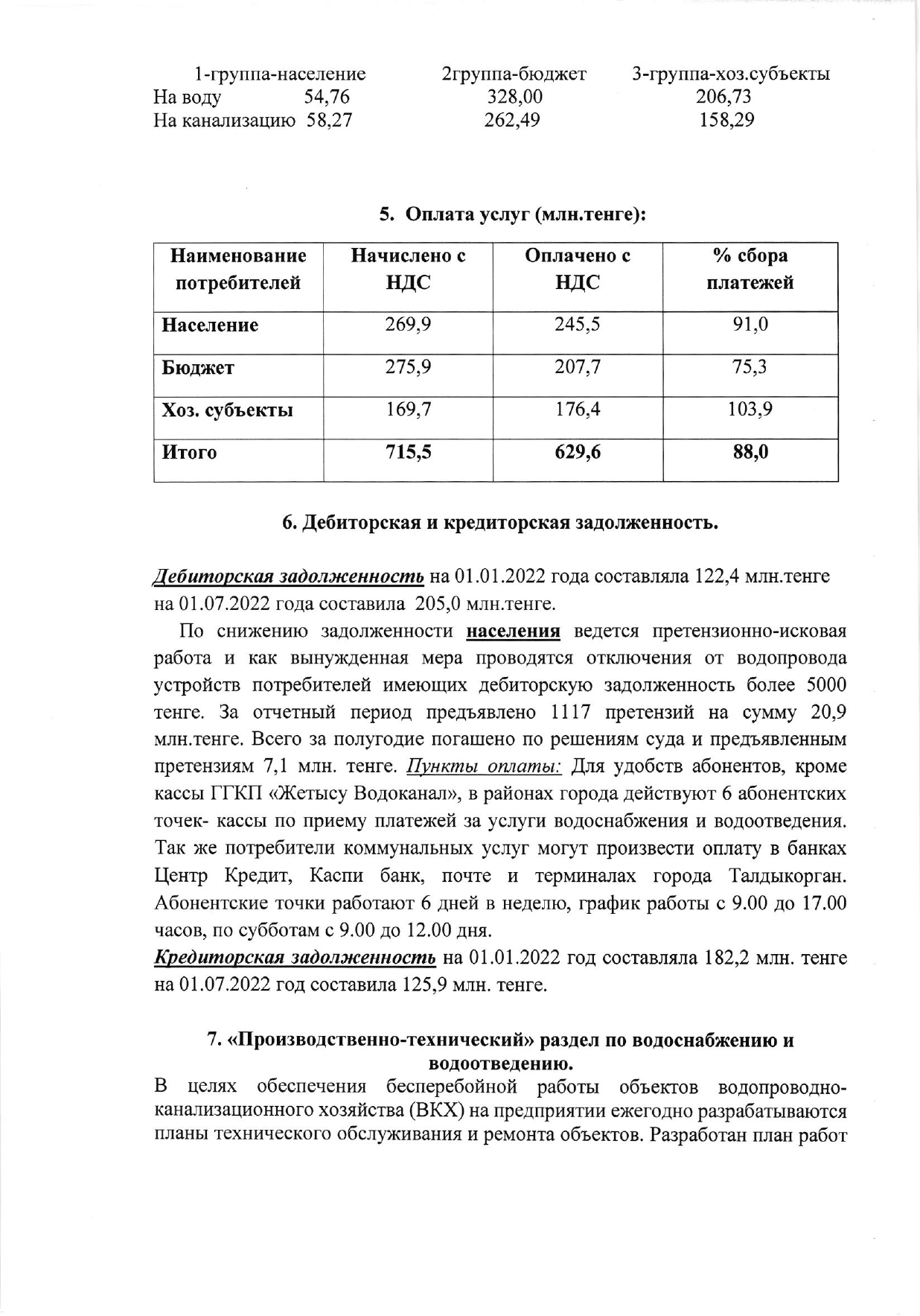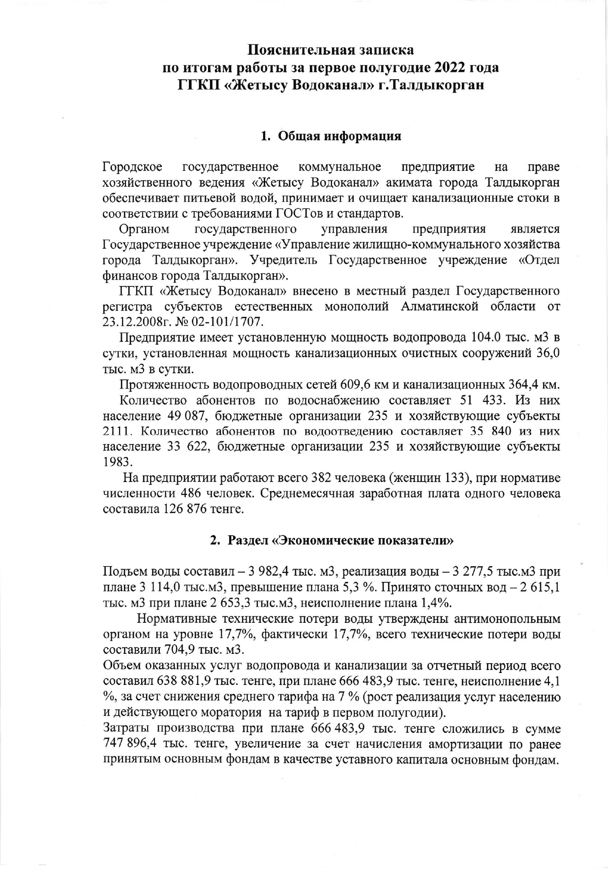 Отчет ГГКП "Жетысу Водоканал" за 1 полугодие 2022 год