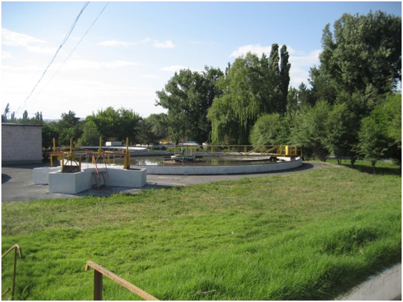 Очистные сооружения канализации г. Талдыкорган. Очистные сооружения канализации г. Талдыкорган расположены в северо- западной части города. Запущены в 1977 году. Проектная производительность сооружений- 36000 м /сутки. Фактическая 3 производительность - 18000- 24000 м / сутки. На ОСК принят метод полной биологической очистки сточных вод с доочисткой на биологических прудах. Все сточные воды города поступают на очистные сооружения по ж/б коллектору диам. 1200 мм. в приёмную камеру, где она распределяется по лоткам и поступает в здание решёток. В здании решёток вода очищается от крупного мусора, задержанного на решётках и удаляемого граблями в шнековый транспортёр, затем в шнековый отжимной пресс для удаления воды из мусора. Отжатый мусор по трубопроводу сбрасывается в контейнер. Сточная вода, очищенная от крупного мусора, поступает по лоткам в горизонтальные песколовки с круговым движением воды диаметром б м. для удаления минеральных загрязнений. Минеральные загрязнения, задержанные на песколовках, удаляются гидроэлеваторами на песковую площадку один раз в сутки. Далее стоки поступают на распределительную чашу первичных отстойников для распределения по рабочим отстойникам. Отстойники радиальные диаметром 24 м. в количестве 4 шт. В отстойниках, взвешенные вещества, осаждаясь на днище собираются скребками, расположенными на вращающейся ферме в приямок, откуда удаляются насосами в аэробный стабилизатор для сбраживания осадка. Стабилизатор - прямоугольный резервуар длиной 72м, шириной 18м, глубиной 4,4м. количество- 2 шт. Осадок после сбраживания удаляется на иловые площадки для обезвоживания и подсушки. Очищенная от взвесей и жировой плёнки сточная вода поступает в аэротенки для биологической очистки. Биологическая очистка происходит с помощью микроорганизмов, жизнедеятельность которых поддерживается кислородом, подаваемым воздуходувкой. Аэротенки- трёхкоридорные длиной 72м, шириной- 18м и глубиной 4,4м. Количество- 2 шт. Сточная вода, очищенная от органических загрязнений, поступает на распределительную чашу вторичных отстойников и распределяется по рабочим отстойникам, где происходит разделение ила и воды. Отстойники радиальные диам. 24 м в количестве 4 шт. Ил, осевший на дне отстойника илососами расположенными на вращающейся ферме, поступает в иловые камеры и эрлифтами откачивается в регенератор аэротенка, а избыточный ил в илоуплотнитель , встроенный в стабилизатор. Очищенная сточная вода поступает в резервуар очищенных стоков, откуда автоматически откачивается насосом на биологические пруды. Биопруды это искусственные водоёмы площадью 55 га, где происходит доочистка от биогенных элементов с помощью кислорода воздуха, растительности, рыбы. После семи каскадов прудов вода обеззараживается гипохлоритом натрия, который вырабатывается путём электролиза раствора поваренной соли в электролизном цехе ОСК. Очищенная, обеззараженная вода по трубопроводу сбрасывается в реку Каратал. На ОСК произведена замена илоскрёбов и илососов на всех отстойниках, замена аэрационных труб на аэротенках и стабилизаторах, замена грабельных решёток, замена пяти насосов. Установлены приборы автоматического хим.анализа на входе и выходе сточной воды. В режиме реального времени можно видеть почасовые показатели нескольких загрязнений, температуру 
